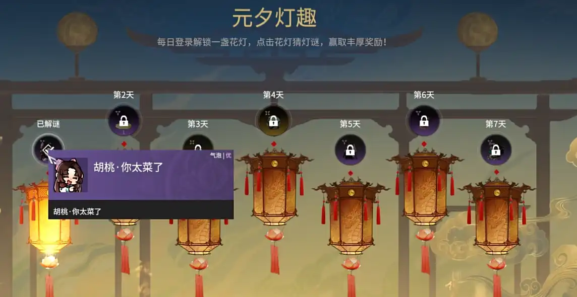 每个玩家都能使用猜谜券参与猜灯谜活动。每次参与会有5道谜题,而谜题的内容也会根据你的答题速度和准确性来评定奖励。每道题目的作答时间只有10秒。答得越快,奖励越丰厚,最快的玩家一次可以获得最多10颗汤圆球。即便是答错了,你也能获得4颗汤圆球作为安慰奖。