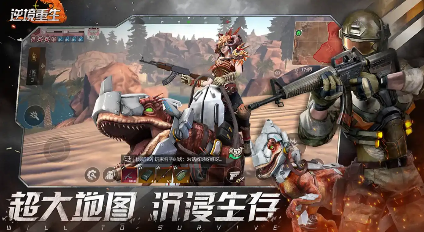 《逆境重生》之中玩家将要进入到一个岌岌可危的末日时代,在这个时代之中,玩家的敌人将不再是环境,而是从地底内复生的恐龙,由于前人类滥用DNA改造技术,在世界之中出现了许多变异体恐龙,其中就包含有机械霸王龙、火焰三角兽、迅猛龙等等,而这些恐龙盘踞了人类曾经的栖息地,玩家将作为恐龙时代的幸存者,需要通过狩猎恐龙的方式,来获得更多的生存可能性。