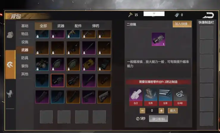 在逆境重生这个游戏可以选择的武器很多,大部分都是枪械,只在最初级的时候会有一些用基础材料制作的刀和剑,后期通过收集就能合成枪械必备的瞄准镜或者是其他零部件,可以组装成枪械供玩家使用,关于游戏里枪械的获取也是比较复杂的,首先先需要去采集铁矿建造精密零件台,做好这一切准备之后才能得到一些基础的枪械配件。
