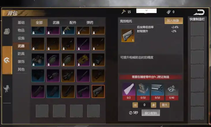 不管是瞄准镜,枪托,弹夹还是比较重要的枪口都是需要玩家自行制作的,可以多去收集铁矿以及其他制作枪械需要的物资,数据完之后就可以去精密零件台制造,等制作完成之后就可以根据自己的需求把这些零件进行组合和搭配,从而得到枪械,这样此后攻击过程中就可以避免和对手保持近距离战斗,能开启远距离的狙击,射杀敌人或者是一些动物。