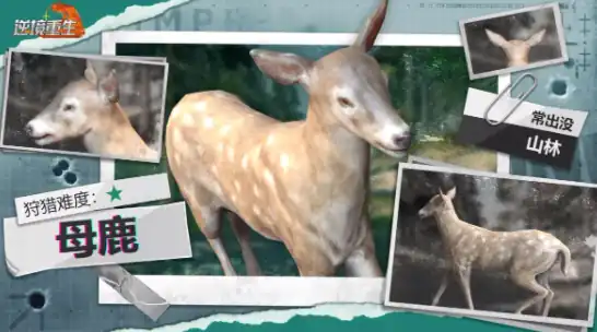 在逆境重生里面会有大量的动物,母鹿会生存在山林里,想要狩猎的话,玩家就需要前往山林寻找,母鹿整体是浅驼色,在身上会有很多梅花状的白色点状毛发,母鹿头上没有角,在寻找的时候要格外注意,玩家可以选择进入山林搜寻动物的踪迹,狩猎难度比较低,可以作为新手初期优先狩猎的动物类型。
