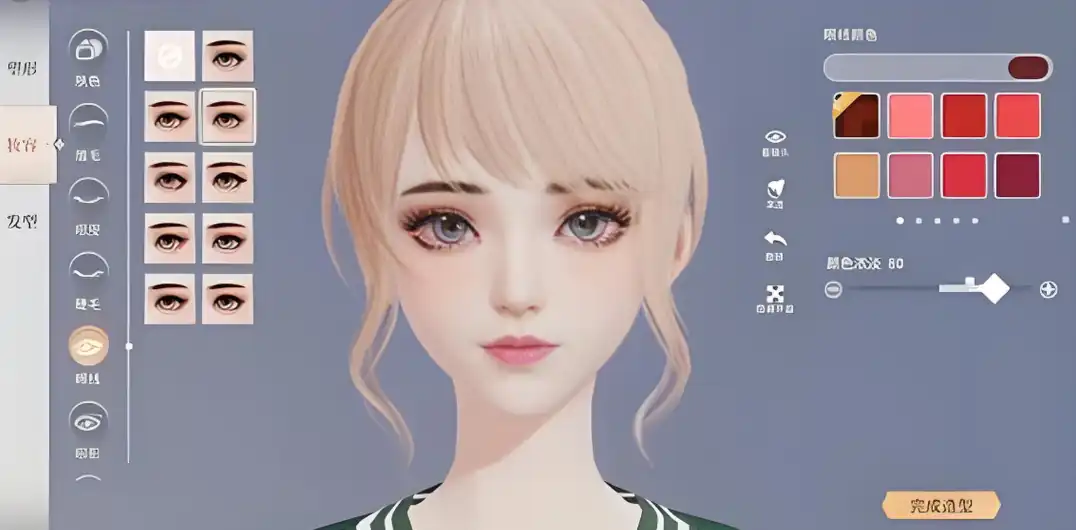 将脸型确定下来之后,就可以根据个人的审美,喜好来对嘴唇的形状,鼻子的挺拔度,眼睛的大小,还有五官之间的距离进行细微的调整,将自定义的脸型设计好了之后,再来对妆容进行选择,比如肤色的情况,睫毛,眼线,眼影之类的选项,这些根据自己的审美调整到自己满意就好。