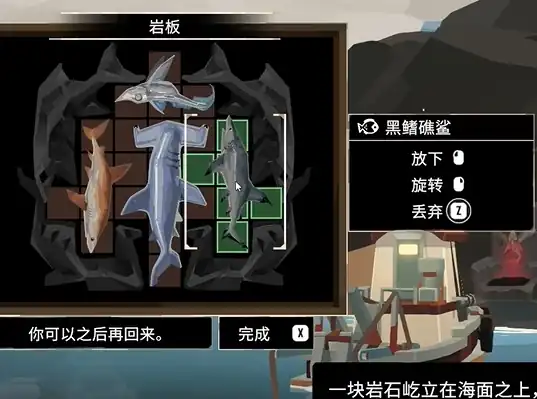 斯特拉尔湾的鲨鱼岩板,这是在小岛法湾区,要捕捉并献祭四种不同的鲨鱼,黑鳍礁鲨(马罗群岛远洋、夜间),短尾真鲨(马罗群岛远洋、白天),锤头鲨(斯特拉尔湾远洋),魔鬼鲨(恶魔之脊深海),奖励是一个L形的吊杆,适合深海和海沟区域捕捞。