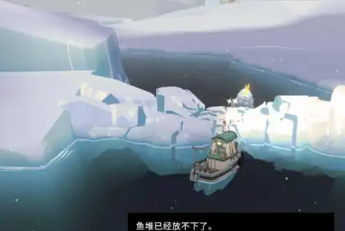 遇到冰川阻碍的情况下,就在架上放满捕捉到的鱼类,然后等独角鲸撞开道路即可,记得用冰鱼的话需要八条,继续深入后能看到金光,靠近后得到第一个破冰犁零件,然后在旁边中心营地处靠岸就能解锁地图。