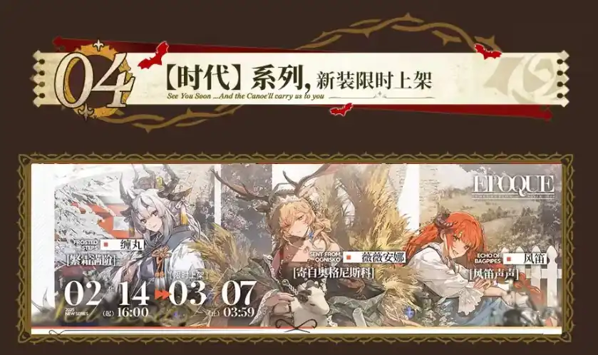 ”时代”系列的新皮肤限时在2.14-3.7出售,本次的新皮肤干员,有薇薇安娜、风笛,以及缠丸这三个角色,都非常的具有特色。新增“玫瑰河畔安全屋”的主题家具,也是限时上架商城,可在2.14到2.28期间购入。