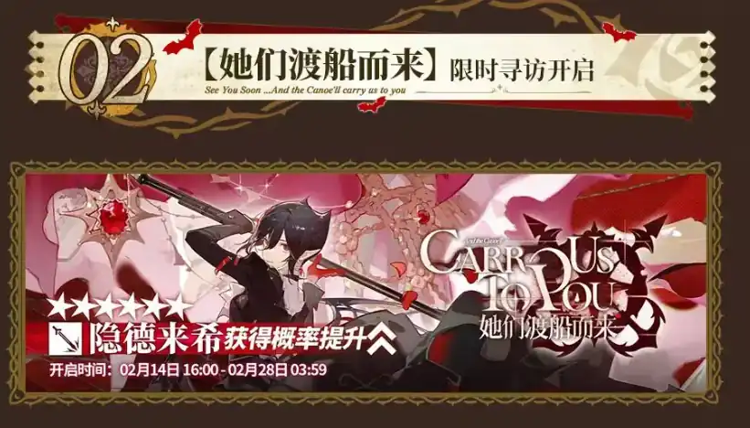 ”她们渡船而来”是本次的限时寻访活动,2.14-2.28可参与,有两位全新的up干员,分别是六星的近卫隐德来希,以及五星的诺威尔,还有五星的温米,新干员上线时,信赖的获取提高,两位全新干员会在2.27日之后加入到常驻卡池里面。