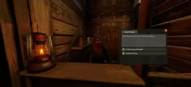 在与飞狼商人的对话中,玩家将看到两个主要的飞行载具选项:迷你直升机和废料运输直升机。每种直升机都有其独特的用途和价格,玩家需要根据自己的需求进行选择。