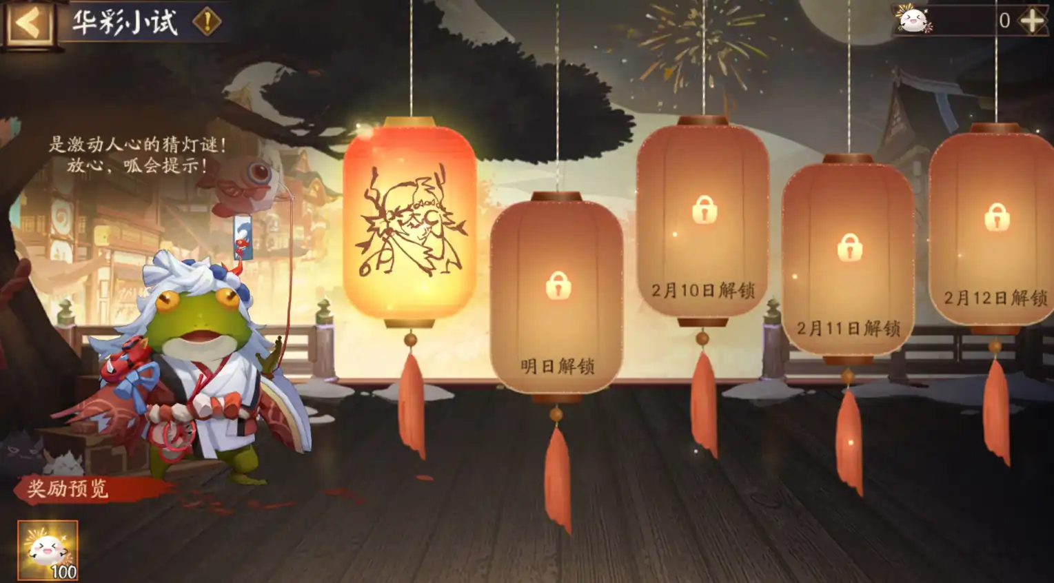 华彩小试则是5个灯谜简笔画,每日会解锁1个灯谜,大家猜对简笔画对应的式神就算胜利,这三种小游戏在获得胜利后都能得到一定数量的“喜乐元宵”,用这个物品就能兑换到各种奖励。