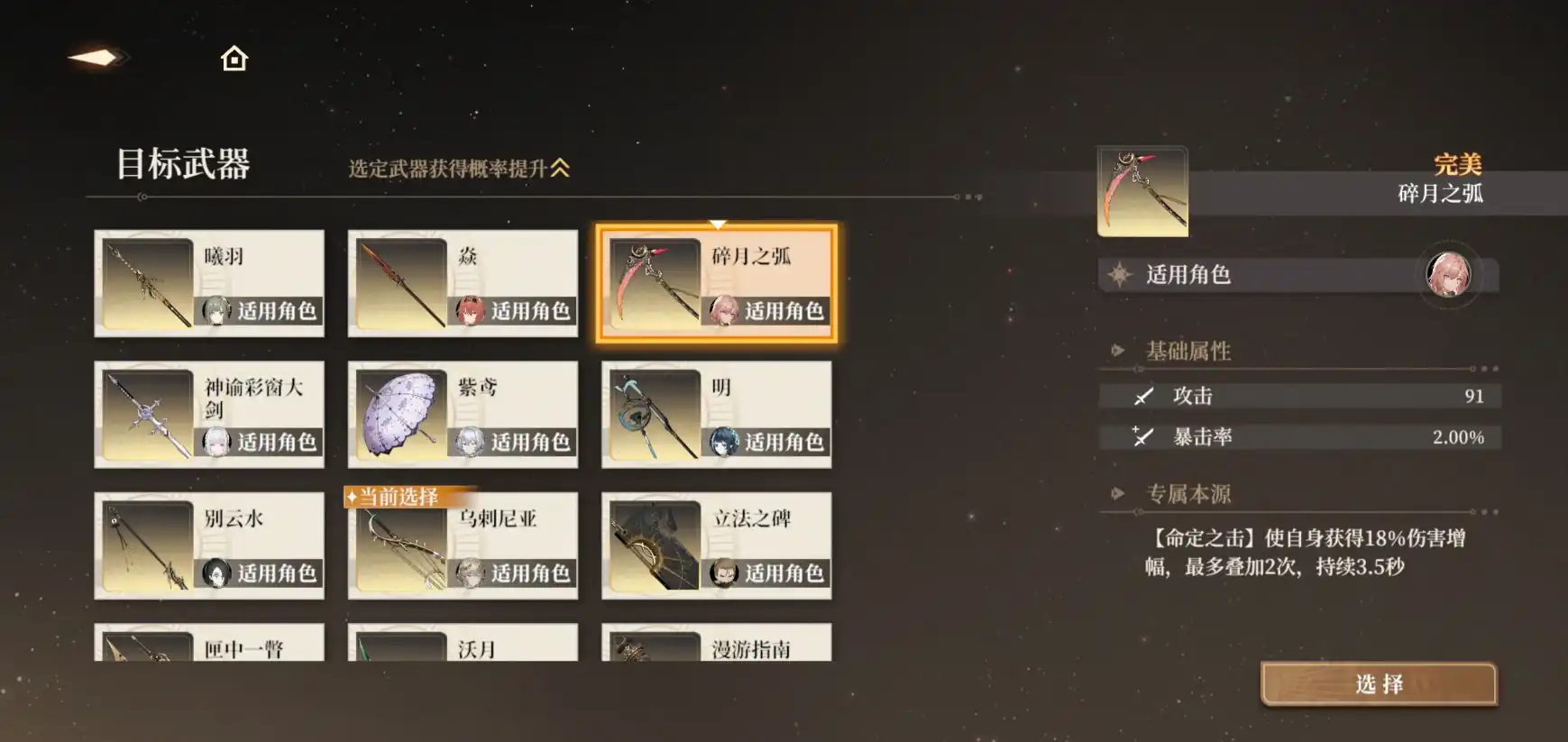 武器9:”碎月之弧”,命定之击使自身获得18%伤害增幅最多叠加2次,能维持3.5秒。