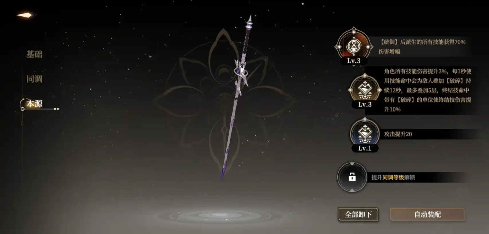武器3:”别云水”,专属本源”锋走龙蛇”,可以让浪伤害提升70%。