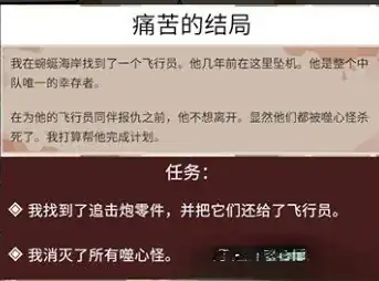 听了飞行员的话后,你决定帮助飞行员报仇,这时系统就会跳出痛苦的结局任务,我们直接点击接受任务,接受任务后,我们要先把追击跑的零件给全部找到。