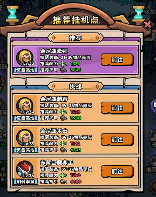 在这款游戏里,英雄冒险团挂机技巧有哪些呢,那就是在野外找个好地方挂机打怪。如果能找到对的挂机地点,升级速度可能就会快很多。可能有的英雄会想,怎么找这样的好地方呢?别担心,其实挺简单的。跟着游戏的主线任务,一路升到6级,我们就会在游戏主界面的右边看到一个推荐挂机的按钮。只要轻轻一点,就能知道现在这个等级最适合去哪里挂机打怪了。