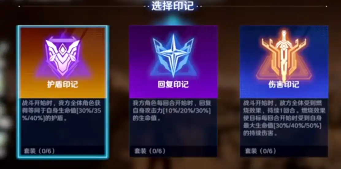 每次成功击败一个敌人后就可以选择不同的印记,如下图所示有护盾印记、回复印记和伤害印记,护盾印记可以在战斗开始的时候让我方所有角色获得一定的护盾值,回复印记能在战斗开始时回复一定生命值。