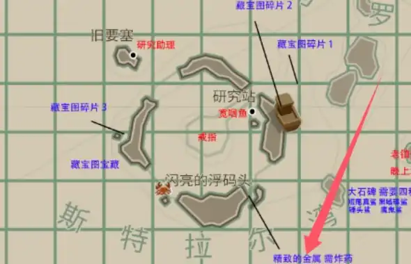 第3块精致的金属可以在马罗群岛找到。在进入马罗群岛之后,小伙伴们需要先来到地图的左边,具体的位置小编也是直接在图片中标示出来了,小伙伴们根据图片中的指引前往即可,需要注意的是这里同样是需要炸药的,大家一定要记得携带哦。