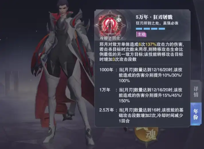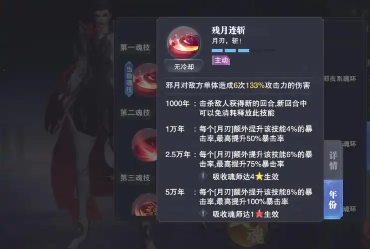 1万年魂环时,若攻击造成的伤害低于目标生命值的,2%乘以月刃数量,且未成功斩杀则此次攻击的最终伤害将大幅提升50%,后期魂环年数提升时,每层月刃还会额外为邪月提供3%的暴击伤害,再看狂刃屠戮技能,这是邪月针对敌方单体的强力攻击手段,可造成6次137%攻击力的伤害,倘若在击杀目标后攻击次数还有剩余,攻击目标便会转移至生命比例最低的另一敌方单位,并且在转移攻击目标时还会额外增加3次攻击段数。