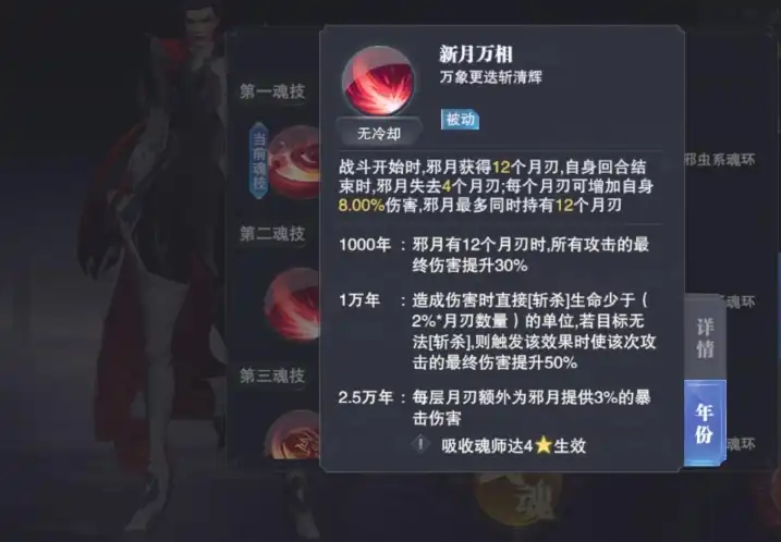 5万年阶段,每个月刃还能使技能暴击率提高8%,最终可达100%的超高暴击率,但需吸收16名魂师才能生效,新月万相放的月刃就是主要输出重点,斩杀就是这个技能自带的一部分额外效果,每出手一次便会消耗4个月刃,越往后月刃越少,战斗到后期输出会逐步走弱,最多同时持有12个月刃,1000年魂环下,邪月拥有12个月刃时,所有攻击的最终伤害能提升30%。