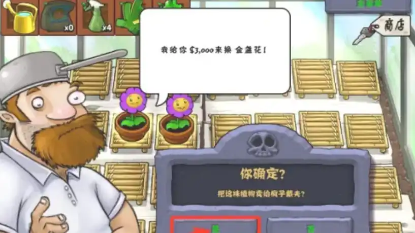 选择了金钱的标志后,将这个标志拖动到自己想要出售的植物上面,在点击一下出售,点完出售后,界面会弹出一个对话框,询问你是否将植物卖给戴夫,确定卖出的话就选择是就可以出售植物了。