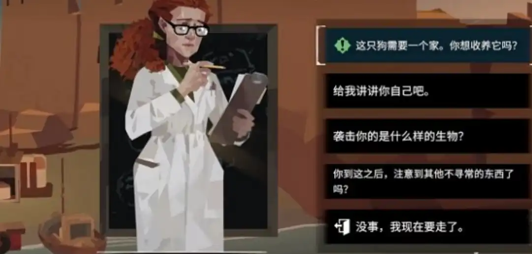 在这五个选项里面我们只要选择第一个选项就可以了,因为我们这个任务就是拯救小狗,而任务最后的结果就是要给小狗一个家,我们想要达成最终的结果那就要收养小狗,其他的选项和这个任务完全没有关系。