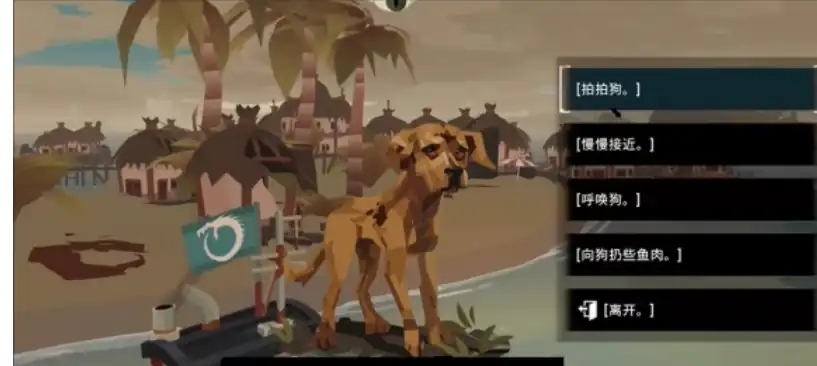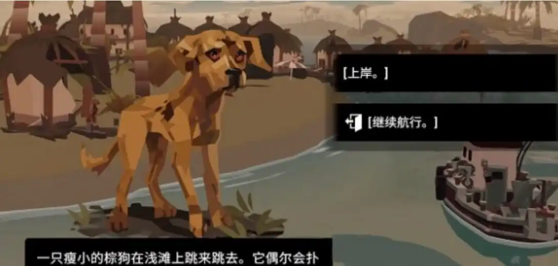 大家在做选择时不要选择继续航行,而是要选择上岸,这样我们基于可以走到浅滩处给小狗喂鱼肉,小狗在吃鱼肉过程中,我们要慢慢的接近它,抚摸它,这样我们才能把小狗给带到船上去。