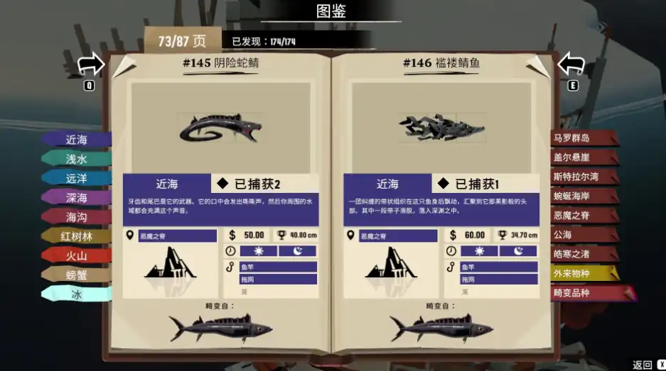 作为一款以钓鱼为主题的游戏,最重要的玩法当然就是前往海洋中进行探险了。小伙伴们可以使用手中的钓具来钓鱼,如果海面上泛起了水花,那就说明这里有鱼,而如果水花是彩色的,那么就说明本次捕捉到了比较稀有的鱼类。这些鱼类根据稀有的程度不同会被标注上不同的价格,小伙伴们可以在回到岸上之后进行贩售,获得的金币可以用来充实自己的装备,随着你渔具等级的提升,所钓到鱼的稀有度也会越来越高哦。另外有些鱼是需要使用特殊的能力才能钓到的,因此小伙伴们也需要不断的升级,并且提升这些特殊技能。