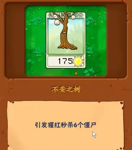 不安之树:可以引发猩红一次直接秒杀6个僵尸,强度要比世界之手强一些,击杀僵尸王也是基本的操作,但是针对精英巨人这类僵尸它们是有部分免疫能力的,所以需要注意避过此时出不安之树,但是免疫效果也只有一次秒杀效果,所以后面要是有其他植物也是可以直接用上去的。