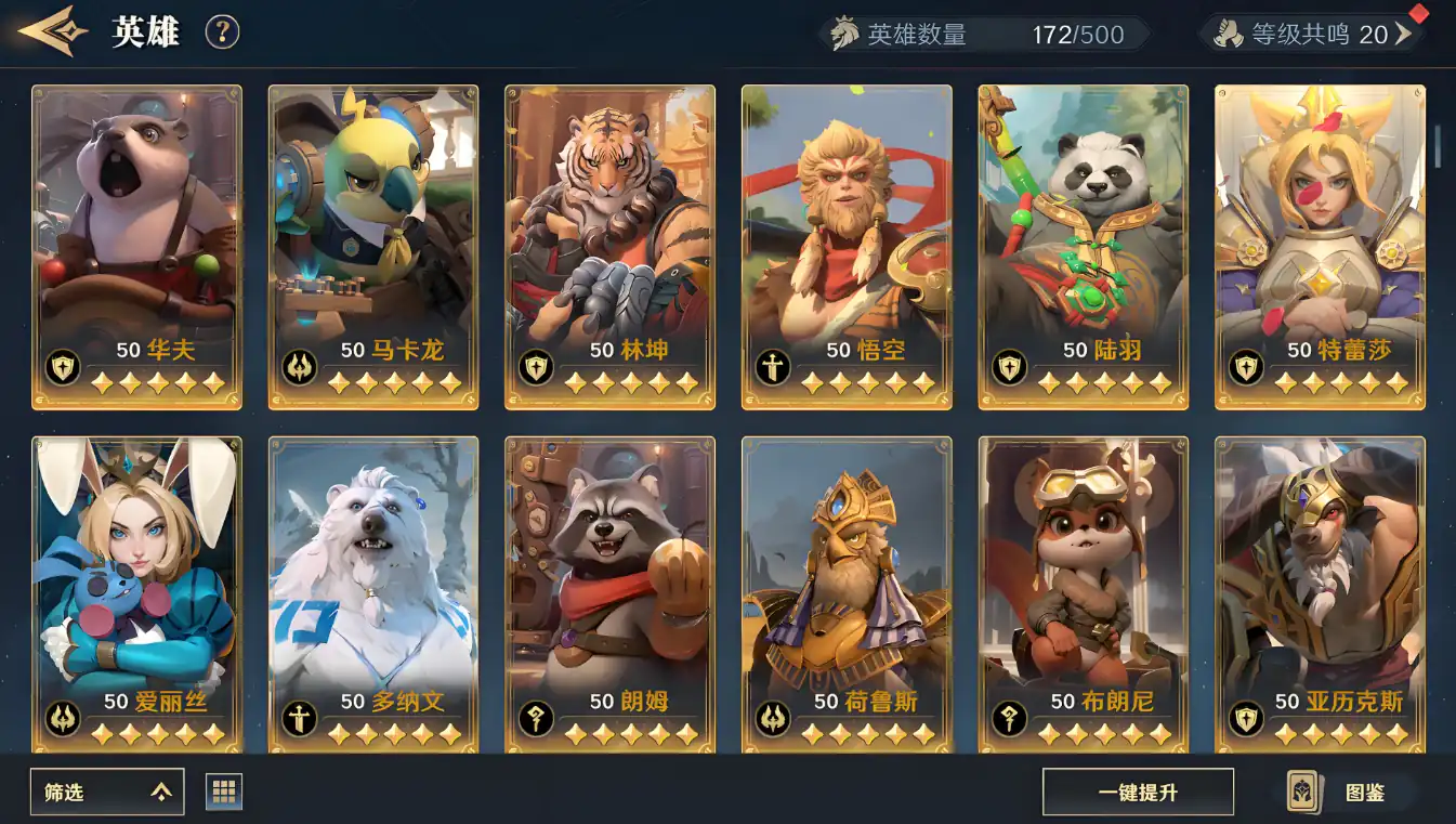 游戏内的的英雄角色设计也都以动物为原型,细致精美的同时还带有象征意义,这些独特的设计吸引大量玩家。游戏中招募的动物英雄可以通过消耗一定数量的相同英雄,来进行品阶进阶,这样玩家可以不用依赖抽卡,就可以拥有高阶英雄。