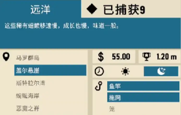 在钓取时间方面的话,其实并没有明确的限制。玩家只要来到了对应的区域,想什么时候去钓魔鬼鱼都是可以的。不过区域选择方面一定要注意,只能够在盖尔悬崖指定的位置,至于其他的位置是否能够钓取魔鬼鱼,在游戏当中并没有明确说明。