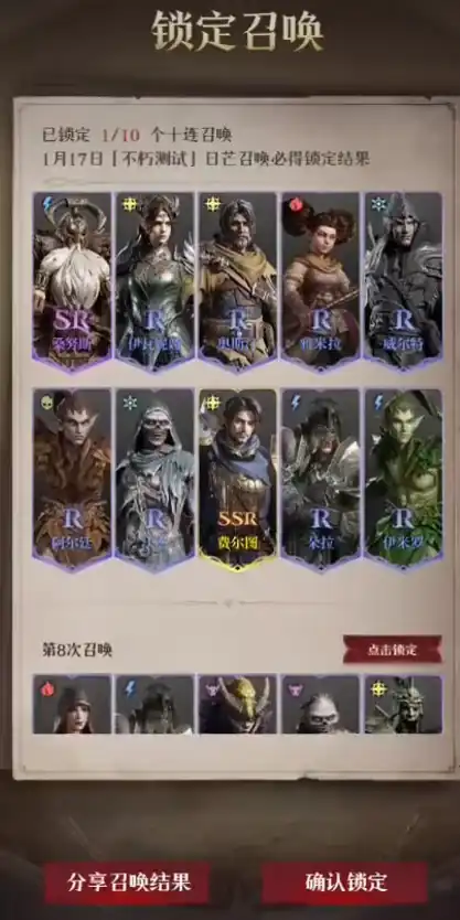 锁定的次数最多10次,也就是说,如果你对某次抽卡的结果特别心仪,可以将这一结果“固定”,让它成为你在“不朽测试”开始后,游戏中的实际抽卡结果。这一机制可以让你避免拼运气,确保自己在游戏正式上线后,能够顺利得到心仪的角色。
