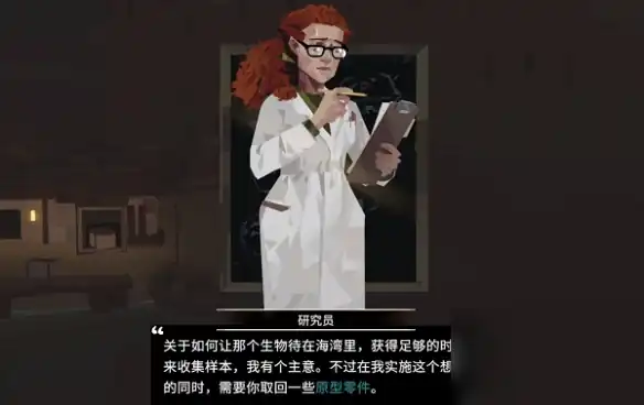 因为研究院没有深水区的捕捞设备,为了帮助研究院得到深水区的样子,你需要按照研究院的要求先去寻找原型零件,接受这个任务。