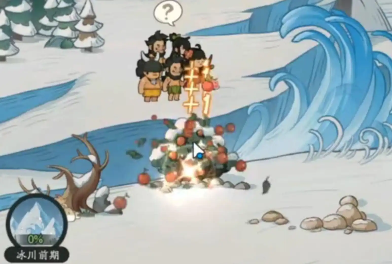 玩家在体验这款游戏的时候,他们肯定要紧紧跟着主线任务,这时候就需要具体的玩法是获取对应的资源,而在冰川时代,食物是特别重要的,也是十分紧缺的,这时候玩家需要在果树上面采集食物来保族人的生存。