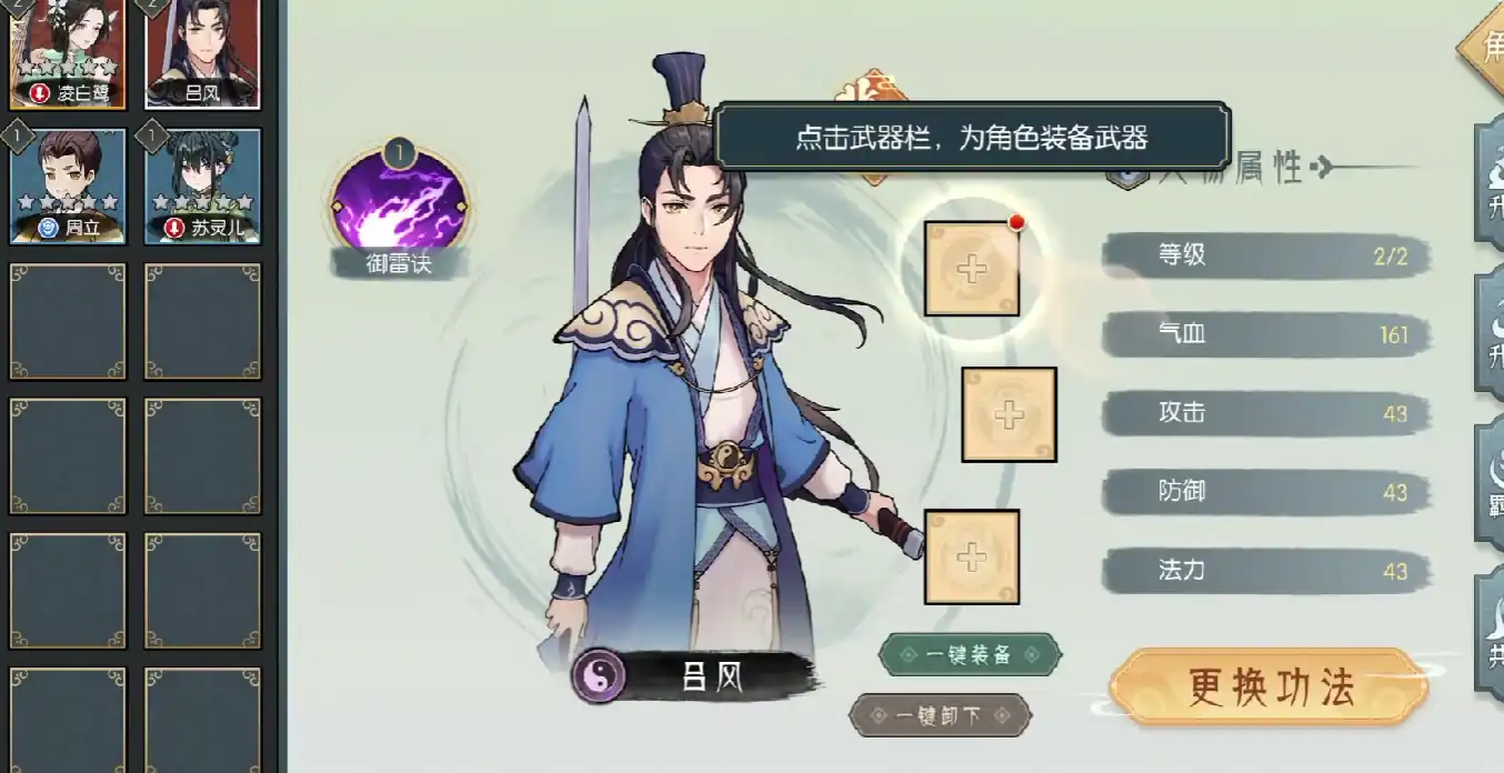 吕风在游戏当中的级别为红色属性, 他的基础属性值为雷属性,拥有的专属技能为御雷决,在等级初始的状态之下,吕风可以拥有气血161点,攻击数值是13点,防御数值43点,法力数值43点,是游戏当中综合性比较强的一个角色,在针对前期推图的情况下,吕风有着不错的发挥。