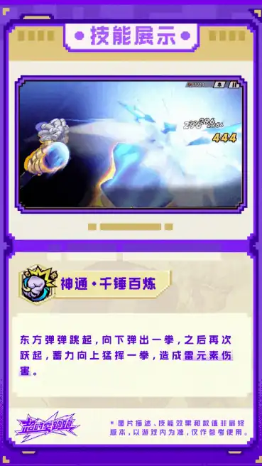 神通则是千锤百炼,当该角色跃起以后向下弹出一拳,而当角色达到最高点位时,则需要玩家抓住时机蓄力向上,并带着最高的力量和速度狠狠砸向敌人,此时造成的雷元素伤害值会达到最大。