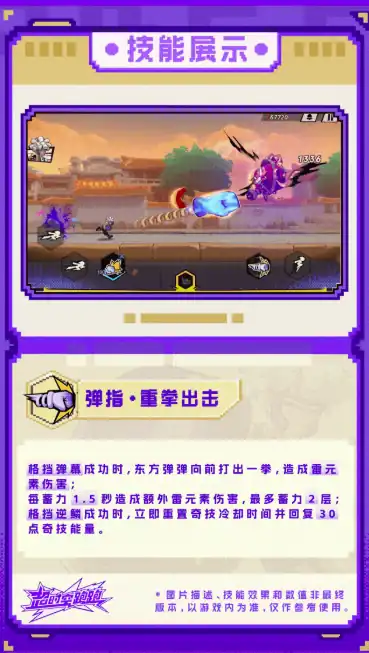 该角色作为游戏当中的热血少年和拳击英雄,其实其主要的技能也是围绕着这两个角色设定的。那么就先来聊聊他的第一技能弹指重拳出击,这个角色的智力法宝就是它伸缩自如的弹簧拳套,玩家在使用第一技能时格挡弹幕成功之后,该角色就会释放弹簧并向前方出拳,造成雷元素伤害效果,且在蓄力1.5秒之后则可使得弹簧的冲击效果加倍,但需要注意的是这个效果最多蓄力两层。