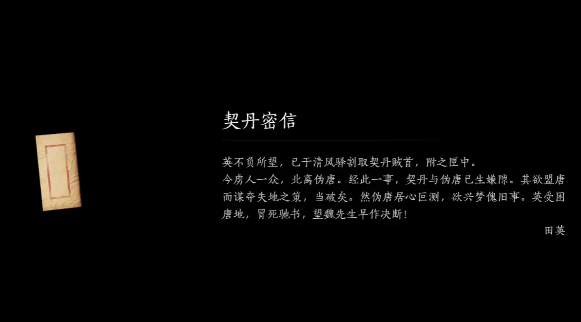 在了解褚清泉的同时,玩家也可以了解到在游戏当中的一些基础设定,例如玩家在地穴当中会获取一封密函,这是契丹密信,契丹此时已经南下,决定与唐展开战斗,而此时,由于十六州的混乱,各路英豪层出不穷,都想要收复中原,其中就有烟云七雄出世,烟云七雄的首领是田英,田英和寒姨以及褚清泉一系的人,都是燕云混乱历史文化当中出现的豪杰。