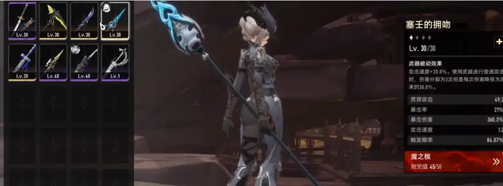 是一把比较稀有的武器,这把武器本身属于太刀类型。武器可以增加20%的攻击速度,普工时武器本身还能分裂出3次伤害。