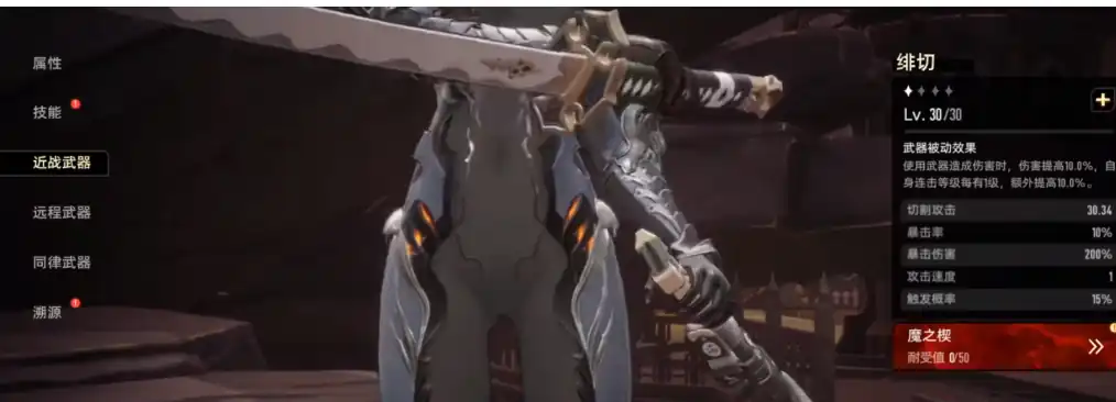 绯切是一把单手剑,这种武器是近战专用的武器之一,打击感极强,武器还能提高10%的伤害,进行连击时,还会在额外增加10%的伤害。