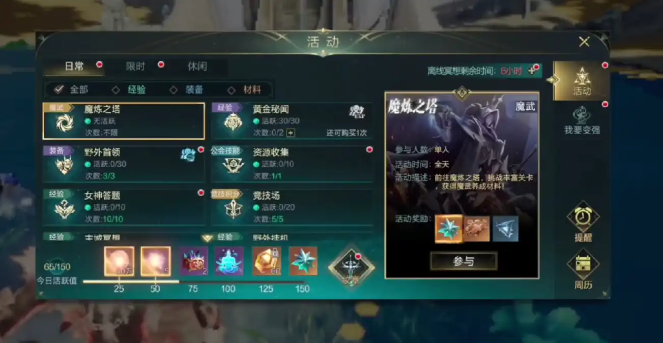 魔域禁地位于黄金秘闻当中,他需要玩家每日的活跃度达到三十点时,才能够开启,每日的挑战为两次,玩家总共可以购买一次额外的挑战机会多号魔域境地不仅可以给玩家提供经验数值,还能够帮助玩家获得进阶道具。