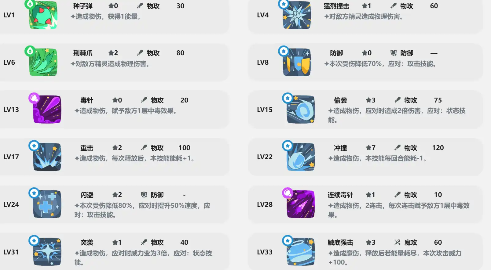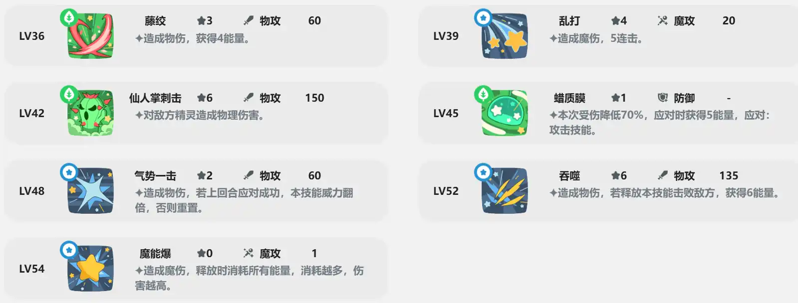 技能的组成上主要依靠能量回复、初始物攻中后期魔攻以及施加负面debuff的毒属性持续伤害来削弱对手,相对来说爆发比较低但是独特的毒属性能够在拉锯战中有相当不错的表现,不仅减攻防值还可以添加减速等效果。初级技能藤绞为种子弹,每次攻击获得1点能量。前期主要的伤害就靠种子弹、猛烈撞击、荆棘爪,但伤害很低主要为了积攒能量。中期作用开始明显,拥有技能毒针、连续毒针、偷袭,开始施加毒性伤害,毒针与连续毒针叠加能够造成3层毒性,持续伤害很不错。后期可以用藤绞+乱打+吞噬来打出不错的输出以及回复大量能量,终极技能魔能爆可以消耗所有能量,根据消耗能量的数值造成高额伤害,因此该技能最好等待能量最大时来利用。