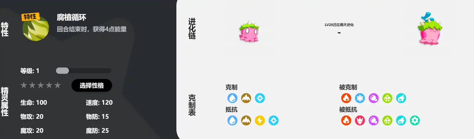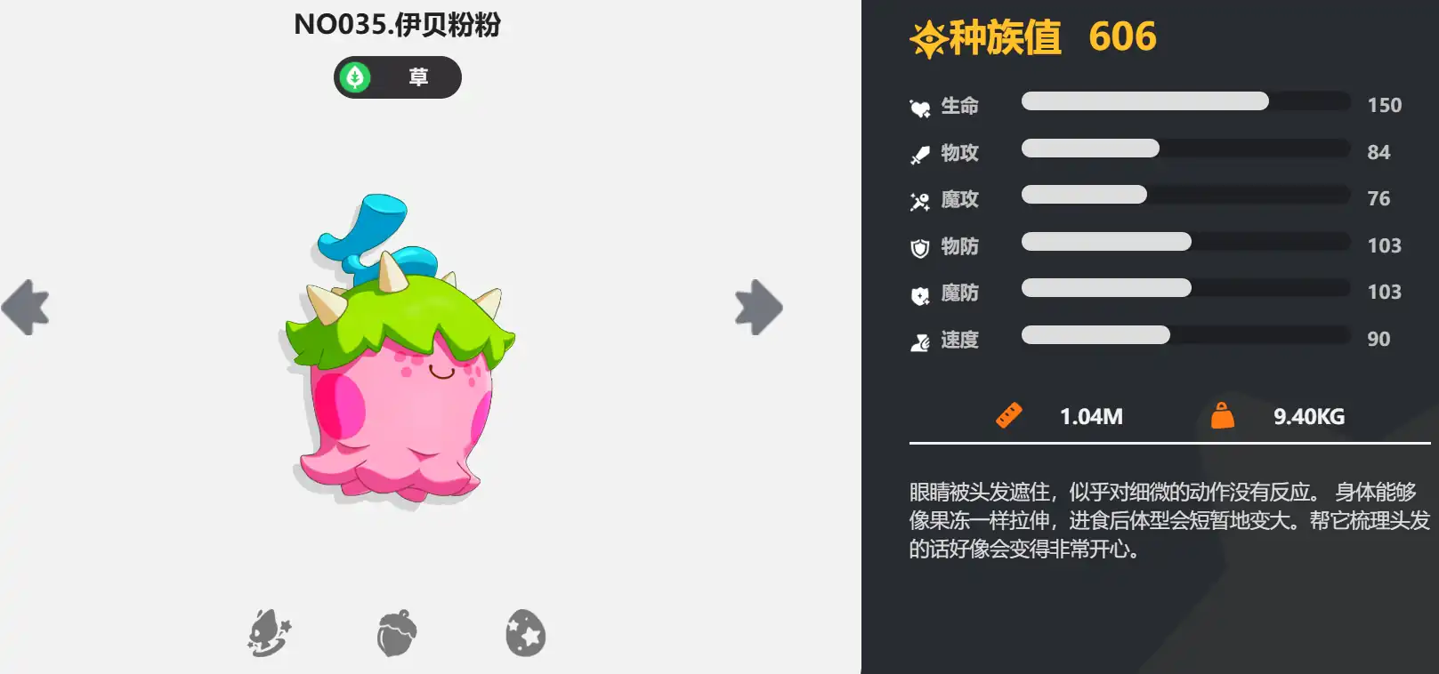 伊贝粉粉属于草属性宠物,其特性是腐植循环,效果为回合结束时获得4点能量。初始面板数值为生命100,物攻魔攻均为20,物防15魔防25,速度120,成长后的种族值之和能达到606,这个数值在中后期的角色中算是很不错。而且培养后的生命值明显高出其他精灵,在抗伤害上会有不错的表现。初始形态为伊贝尔,30级后进化成伊贝粉粉。