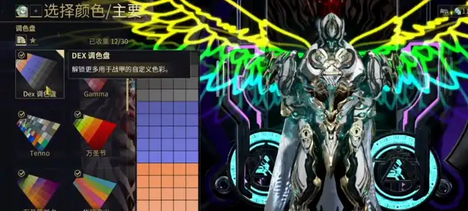 游戏中搭配的颜色,也非常重要的,选择比较浅的黑色,当做第三色的彩色,如果想要来选择放射的颜色,可以前往虚空商人,在它的左上角,会有一个调色板,没有太多的局限性。