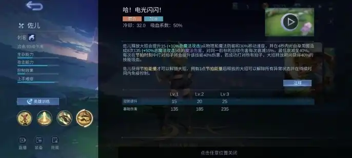 佐儿的终极技能是其最为强大的杀手锏,在激活终极技能后,佐儿可以获得强大的魔法防御力和速度提升,在4秒内对周围敌人造成8次高强度伤害,并获得40%的生命偷取效果。在短时间内变成了战场上的一大威胁,不仅能够持续输出高额伤害,还能通过生命偷取保持自己的生存。