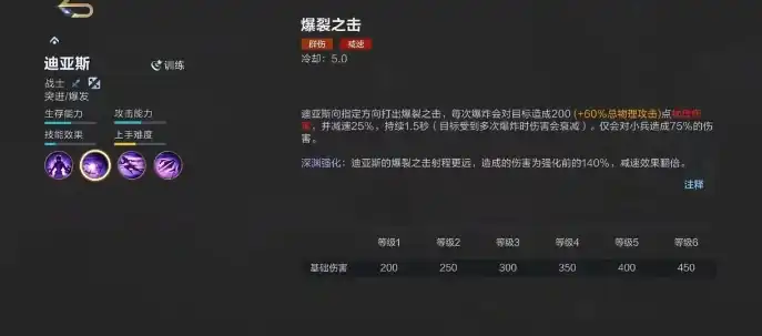 一技能爆裂之击是一记强力的远程攻击,可以向指定方向发动一次爆裂冲击,对前方的敌人造成物理伤害,并使其减速。深渊强化后,这一技能的射程、伤害及减速效果都会得到显著提升。对于小兵,这一技能只能造成75%的伤害,但在对抗英雄时却显得极为有效。