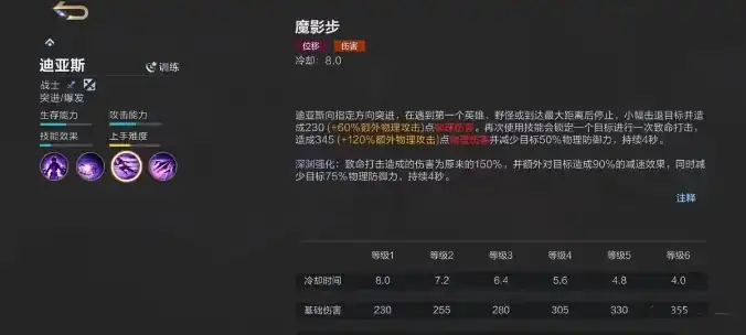 魔影步是迪亚斯的位移技能,允许迪亚斯向指定方向进行快速突进,并对目标造成物理伤害。如果迪亚斯在短时间内再次使用此技能,将对目标发动一次强力打击,进一步造成物理伤害并减少目标的物理防御力50%。在深渊强化下,这次强力打击的伤害会更高,减速效果将增强至75%,同时物理防御力减少效果降至25%。