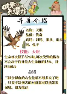 天眼:技能是天眼,要是生命首次低于35%,那么每一次受到的伤害就不会超过于自身15%的最大生命值,并且在三个回合里都会持续有效。三个回合锁血的含金量自然也不需要,大家都说只要不缺伤害的对战,那么都可以找这一个异兽,可以强烈的保底。