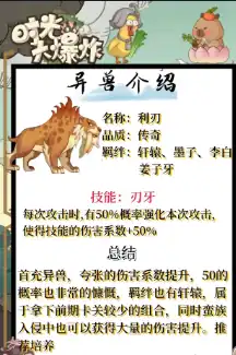 利刃:技能是刃牙,每一次在攻击时就会有50%的机会提升这一次的攻击,能够有效增加10%的伤害系数。首充异兽,会提升夸张的伤害系数,基本也有轩辕。属于拿下之后,在前期无论怎么搭配都没有什么问题的异兽很值得去培养。