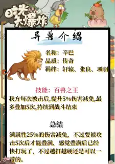 辛巴:技能是百兽之王,我方在每一次被攻击之后就可以提升5%的伤害减免,最高可以叠加5次左右,而且还可以持续到战斗结束。如果要攻击5次之后才有可能会被叠满,感觉叠满之后自然是越打越硬。