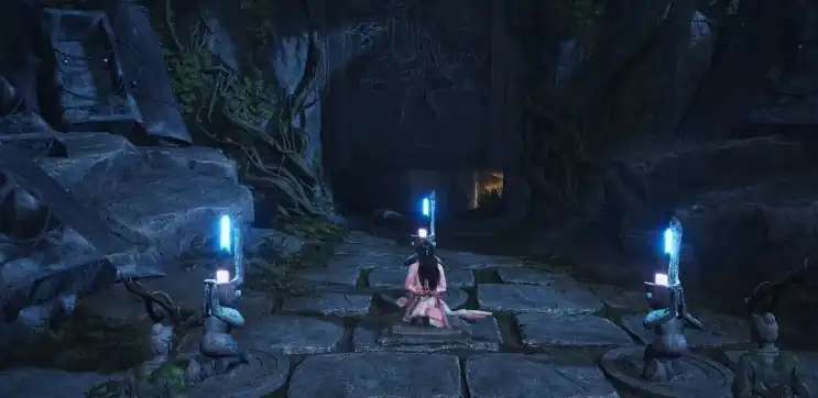 在祭拜的俩村民见到玩家靠近以后就会停止祭拜,此时可去用奇术 “金玉手” 点穴,定住他们,然后到中间的雕像前祭拜,直到三盏灯同时被点亮,此时的门就会打开了。
