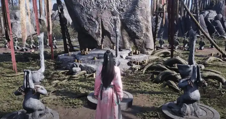 此时大家需去查看跪着的石人,然后在空坐垫处跪下模仿,多坐一会儿直到看到鹿影的出现,此时玩家就能去主动跟随鹿影脚印前进,途中会看到一男一女的幻影,大家需要做的就是去留意他们之间的对话。