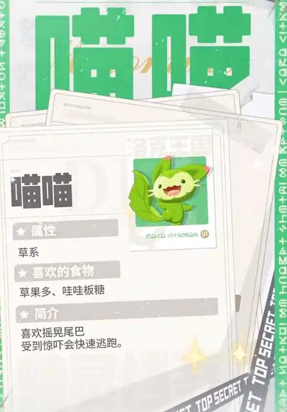 喵喵是一只浑身绿色的小猫。“氧循环”的特性让它在释放草系技能时能恢复自身生命值。1技能“抓挠”,对敌人发动进攻,造成物理伤害,并回复自己能量。2技能“种子弹”,发射种子对敌方造成草系物伤,同时获得能量。3技能“荆棘爪”,融合荆棘之力打出强力爪击,对手遭受草属性物理伤害。技能4“休息回复”,使用后可令它获得百分比回复效果。