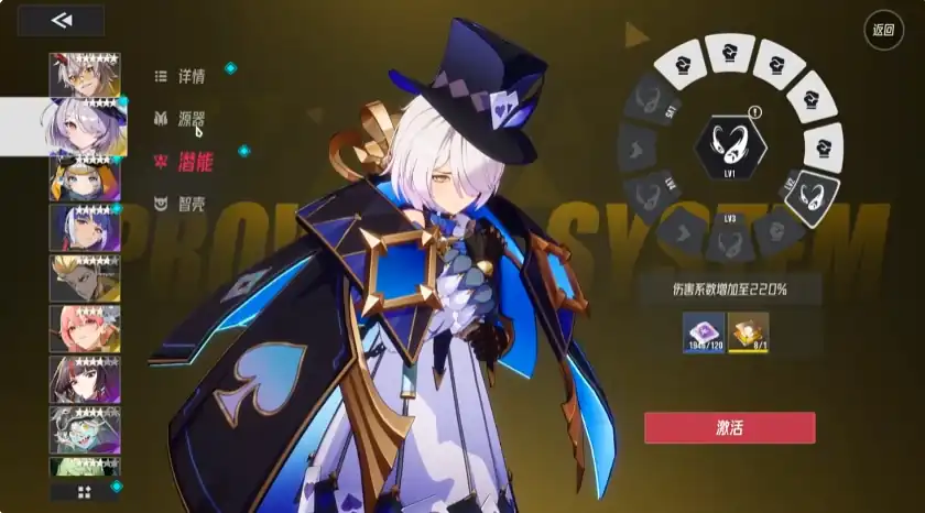 ”帽子戏法”的普攻,能对单个敌人造成200%伤害,额外有40%概率提高自己,外加行动进度最低的友方10%的行动速度,如果队友拥有“双生戏法”,则会对目标进行追击;该效果会在自己每次行动后提高30%行动速度,只能对除了自己之外的一个目标添加该效果。